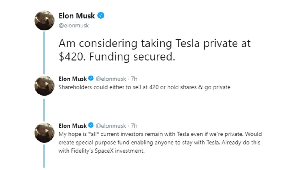 Tesla’nın 2018 civarında yaşadığı ikinci kriz dönemine geri dönelim. Üretim problemleri ve Tesla’nın bu baş döndürücü büyüme hızı, bir noktadan sonra Elon Musk’ın başını gerçekten döndürmeye başlamış olmalı: Öyle ki, CEO düzeyindeki profesyonellerden görmeye alışık olmadığımız türde ve fevrilikteki tweetler nedeniyle zaten zor giden bir süreç daha da zorlaşmaya başladı. Özellikle Elon Musk’ın 2018 yılının Ağustos ayında ansızın ortaya attığı bir tweet, gündeme bomba gibi düşmüştü.
