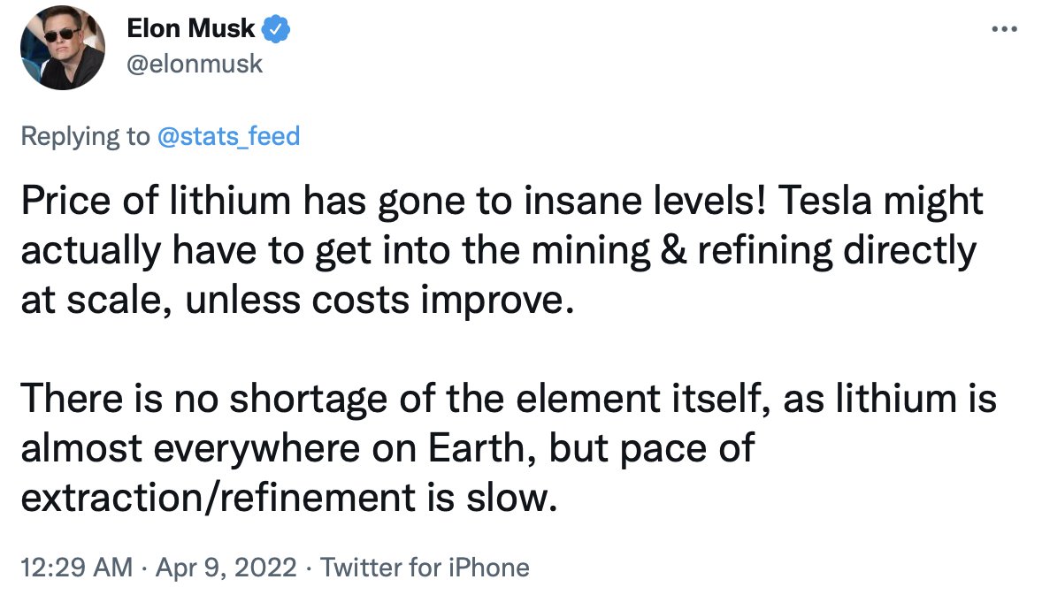 G.R. Morrison. As lithium prices skyrocket, Elon considers Tesla getting into mining industry. Not a Tesla app. 11 Nisan 2022. Link ➔