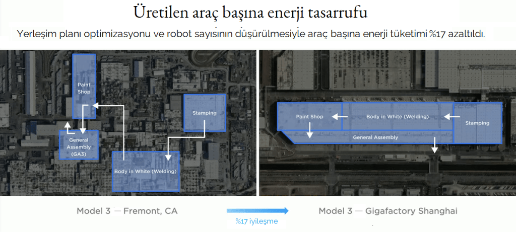 Bu fırsatlara son bir örnek daha verelim: Dikey entegrasyonu ileri bir noktaya taşıdığınızda, fabrikaların yerleşim planlarını da üretilen araç başına enerji tüketimini minimize edecek şekilde oluşturabiliyorsunuz. Bunu belli oranda her şirket yapabilir elbette ama Tesla’da entegrasyonun oranı yüksek olduğu için, bu tür iyileştirmelerle yaratılan kârlılık fırsatlarının etkisi de artıyor. Aşağıda Fremont ve Şangay fabrikalarının bir kıyaslamasını görebilirsiniz: Üretimin akışı monolitik bir yerleşim planı içinde tek yönlü olarak gerçekleşiyor. Tesla’nın dikey entegrasyonu kullanarak bu fırsatları çok daha ileri noktalara taşıyacağını Gigafactory’ler tam kapasiteyle devreye alındığında birlikte göreceğiz.